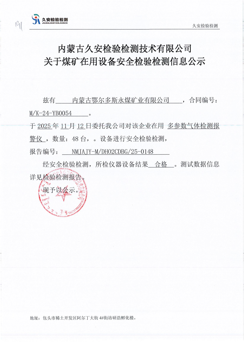191.内蒙古鄂尔多斯永煤矿业有限公司煤矿在用设备安全检验检测信息公示