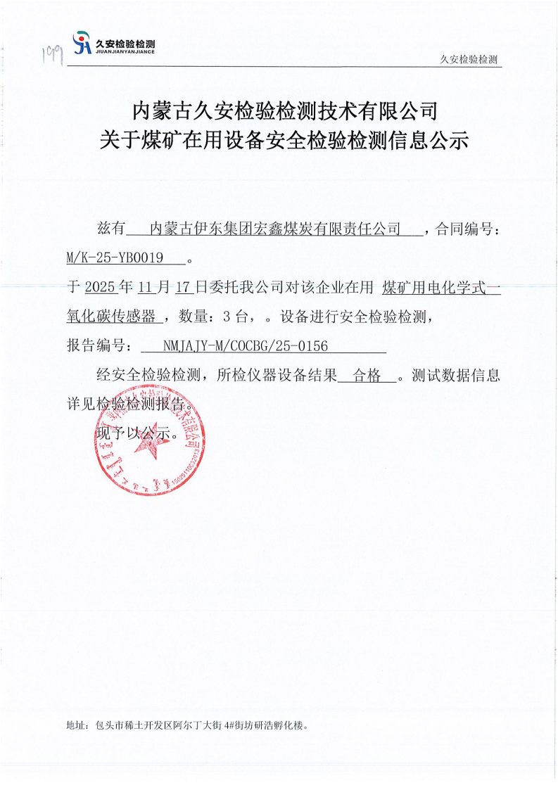 199.内蒙古伊东集团宏鑫煤炭有限责任公司煤矿在用设备安全检验检测信息公示
