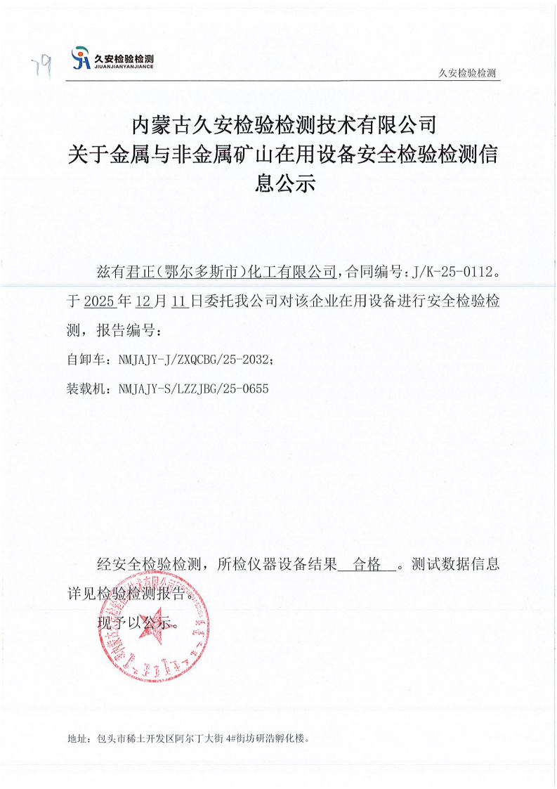 79.君正(鄂尔多斯市)化工有限公司金属非金属矿山在用设备安全检验检测信息公示