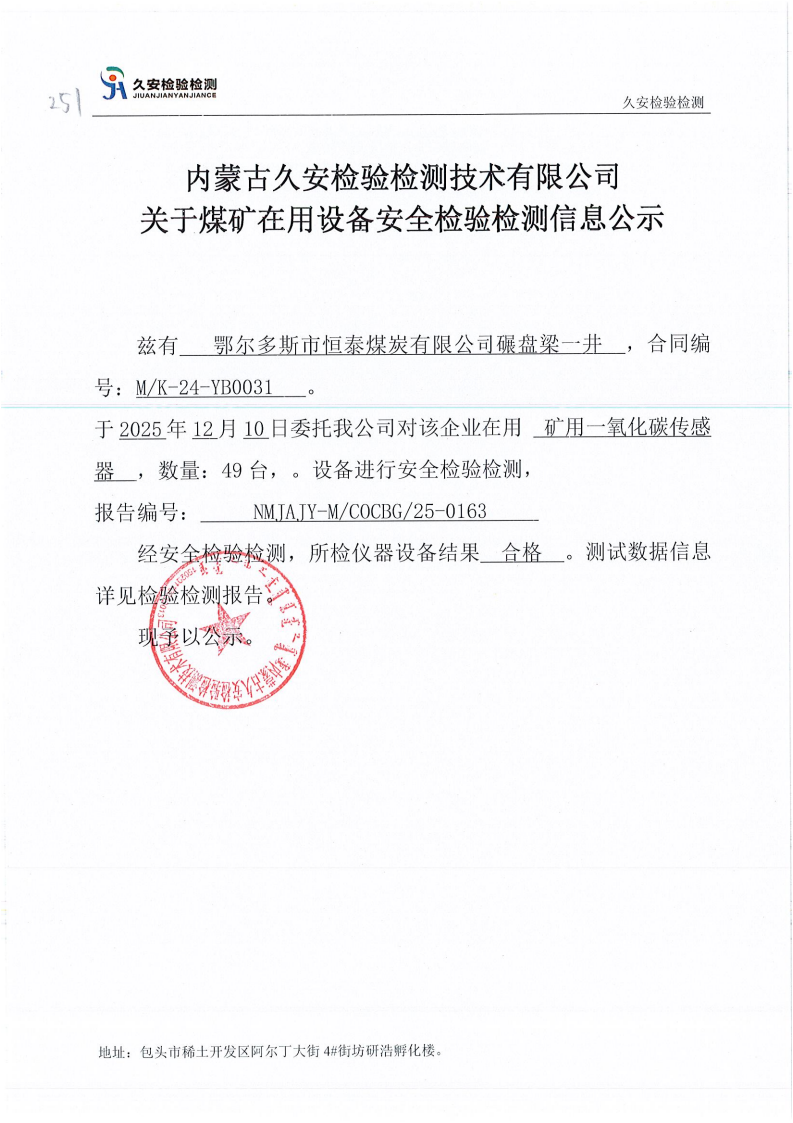 251.鄂尔多斯市恒泰煤炭有限公司碾盘梁一井煤矿在用设备安全检验检测信息公示