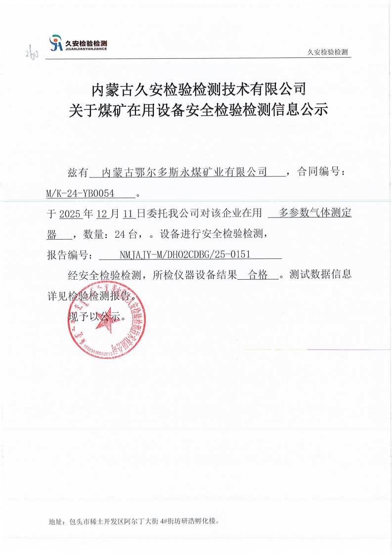 260.内蒙古鄂尔多斯永煤矿业有限公司煤矿在用设备安全检验检测信息公示