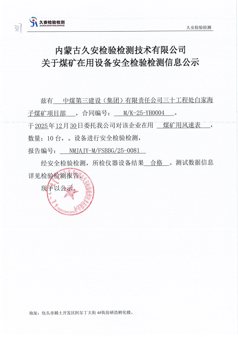 317.中煤第三建设(集团)有限责任公司三十工程处白家海子煤矿项目部煤矿在用设备安全检验检测信息公示