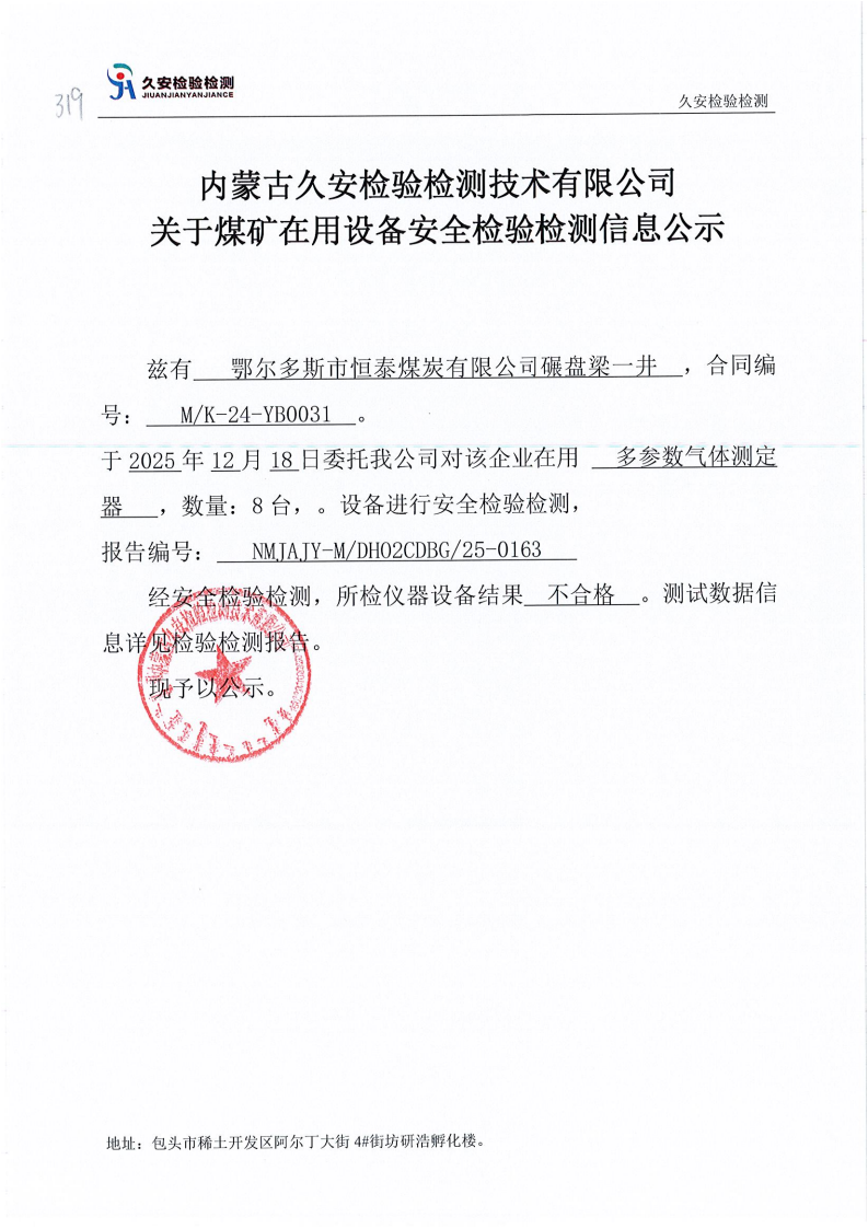 319.鄂尔多斯市恒泰煤炭有限公司碾盘梁一井煤矿在用设备安全检验检测信息公示