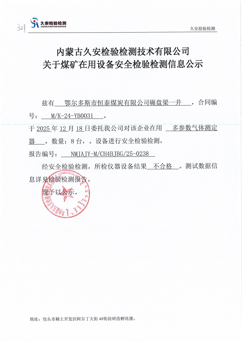 321.鄂尔多斯市恒泰煤炭有限公司碾盘梁一井煤矿在用设备安全检验检测信息公示