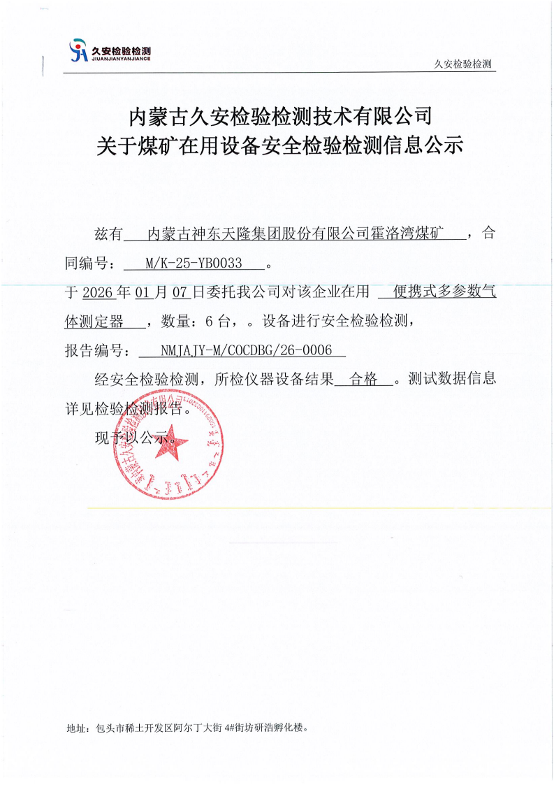 1.内蒙古神东天隆集团股份有限公司霍洛湾煤矿在用设备安全检验检测信息公示