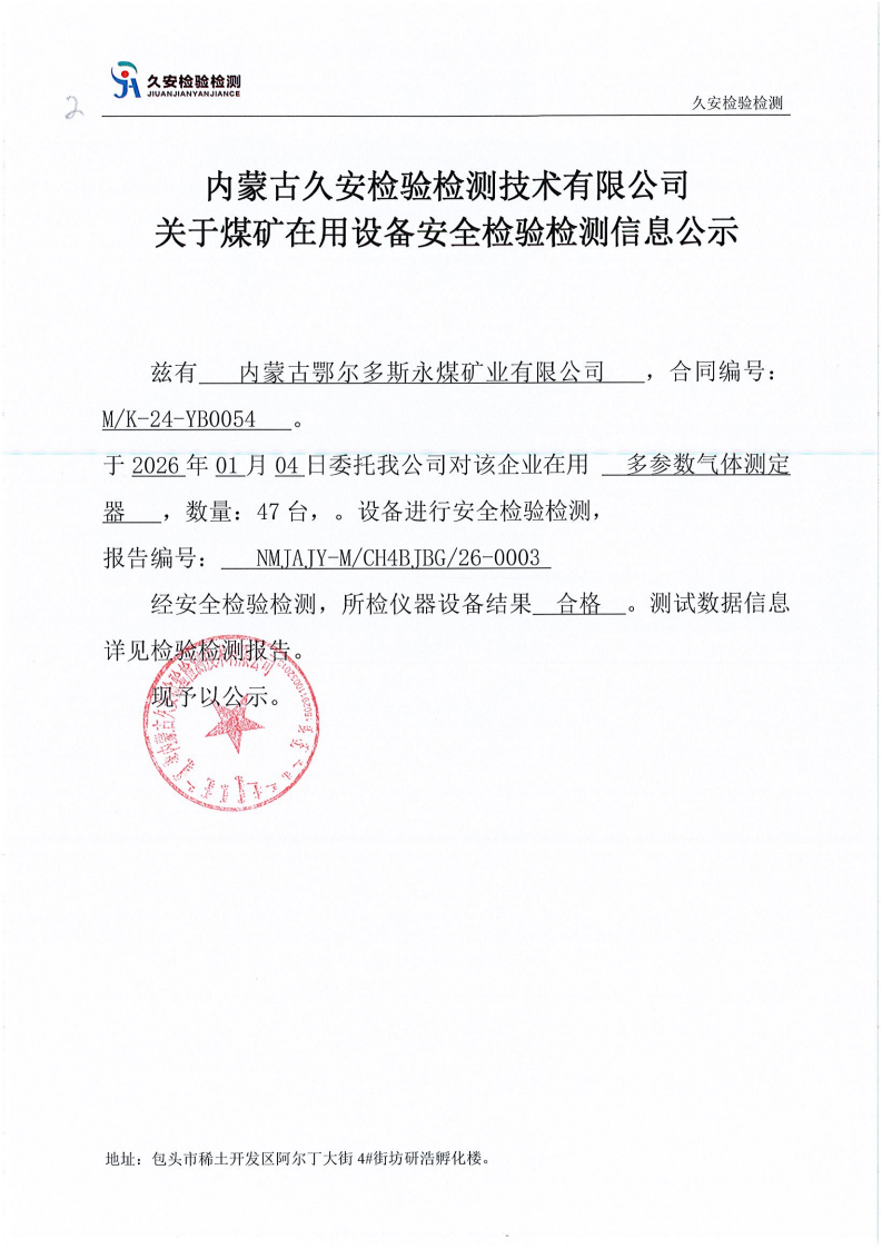 2.内蒙古鄂尔多斯永煤矿业有限公司煤矿在用设备安全检验检测信息公示