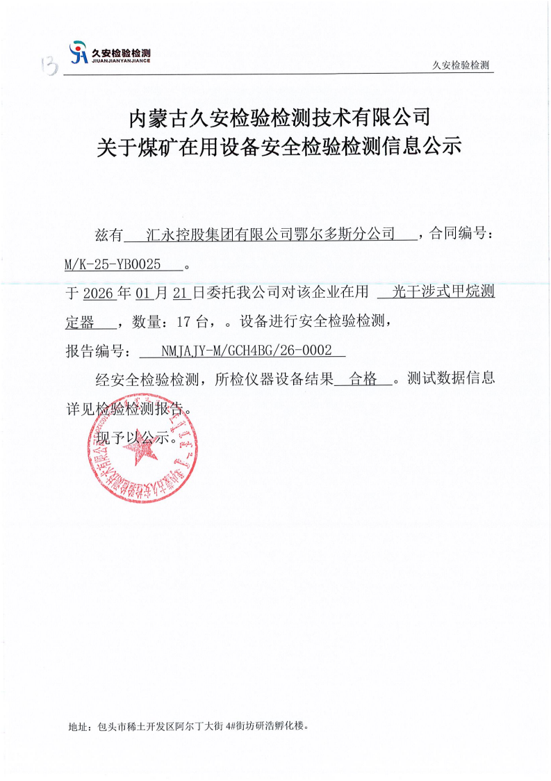 13.汇永控股集团有限公司鄂尔多斯分公司煤矿在用设备安全检验检测信息公示