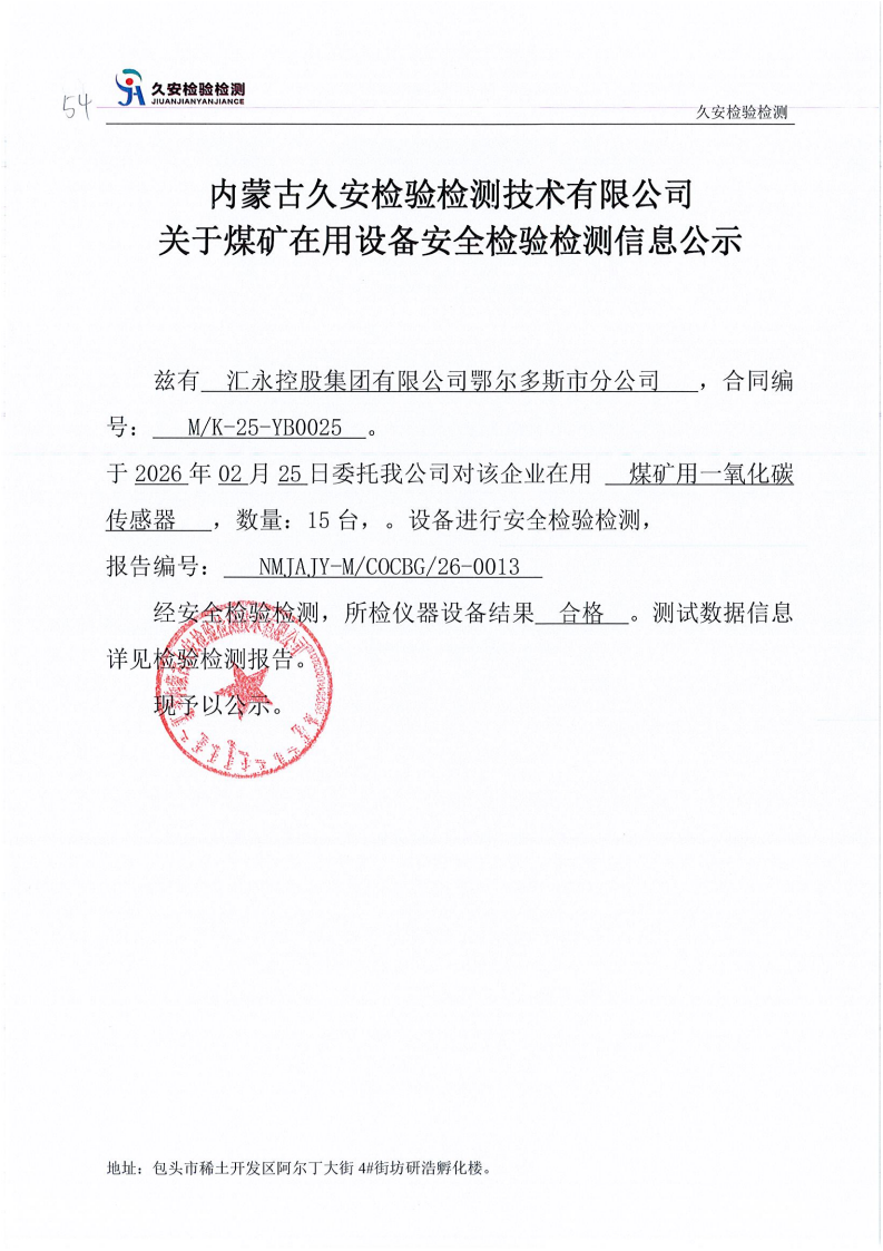 54.汇永控股集团有限公司鄂尔多斯分公司煤矿在用设备安全检验检测信息公示