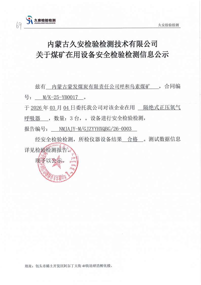 69.内蒙古蒙发煤炭有限责任公司呼和乌素煤矿在用设备安全检验检测信息公示