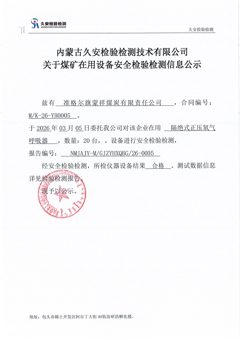 71.准格尔旗蒙祥煤炭有限责任公司煤矿在用设备安全检验检测信息公示