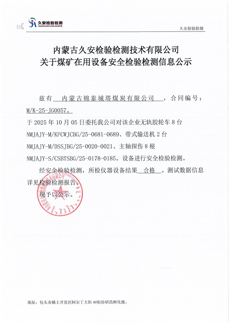 108.内蒙古锦泰城塔煤炭有限公司煤矿在用设备安全检验检测信息公示