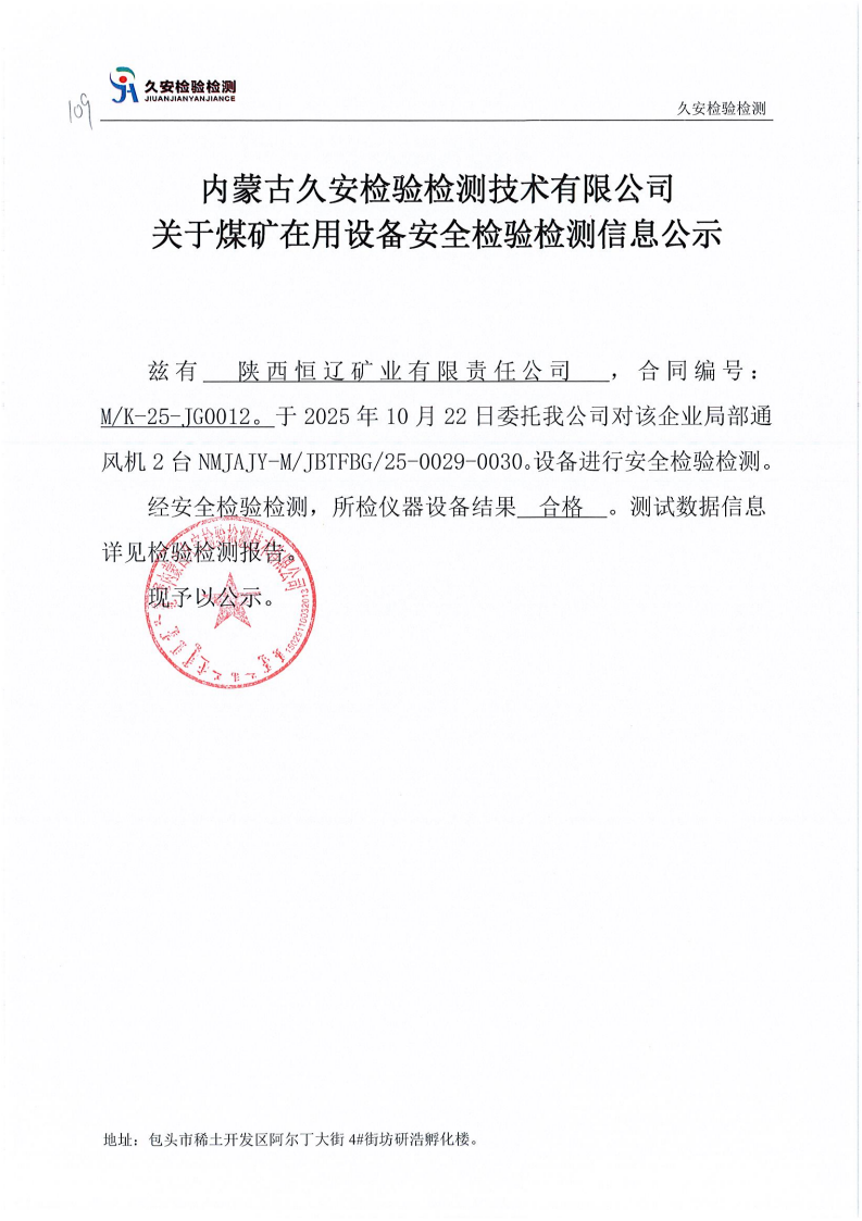 109.陕西恒辽矿业有限责任公司煤矿在用设备安全检验检测信息公示
