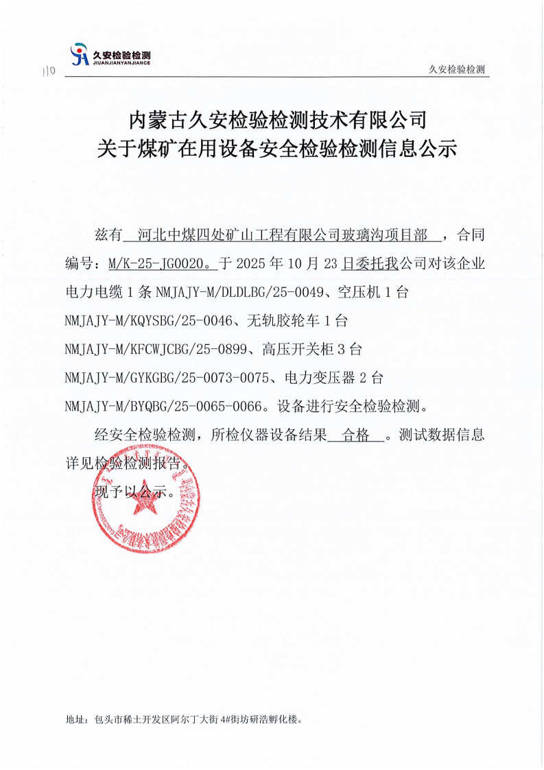 110.河北中煤四处矿山工程有限公司玻璃沟项目部煤矿在用设备安全检验检测信息公示