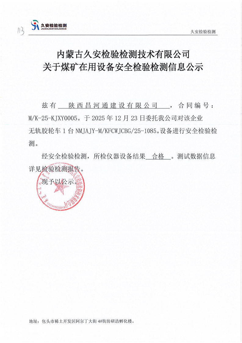 113.陕西昌河通建设有限公司煤矿在用设备安全检验检测信息公示