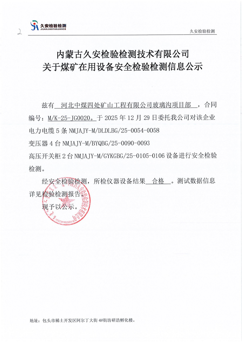 2.河北中煤四处矿山工程有限公司玻璃沟项目部煤矿在用设备安全检验检测信息公示