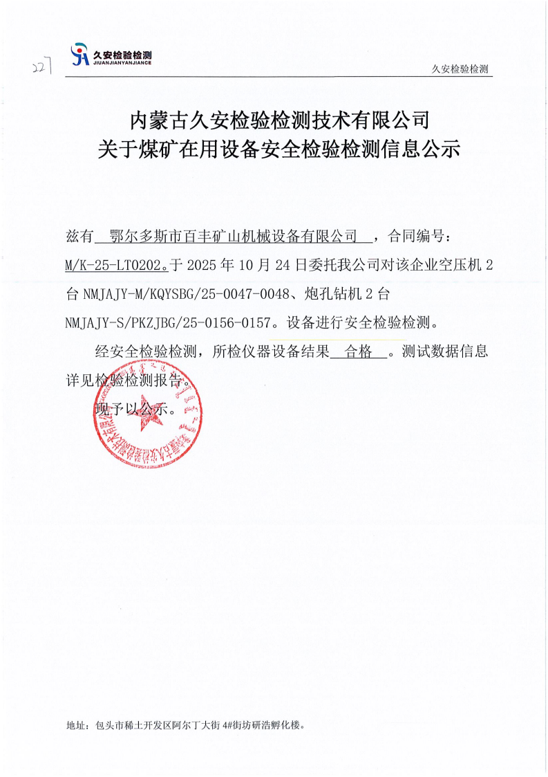227.鄂尔多斯市百丰矿山机械设备有限公司煤矿在用设备安全检验检测信息公示