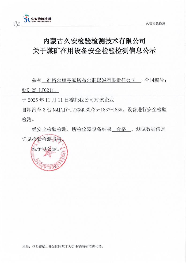 230.准格尔旗弓家塔布尔洞煤炭有限责任公司煤矿在用设备安全检验检测信息公示