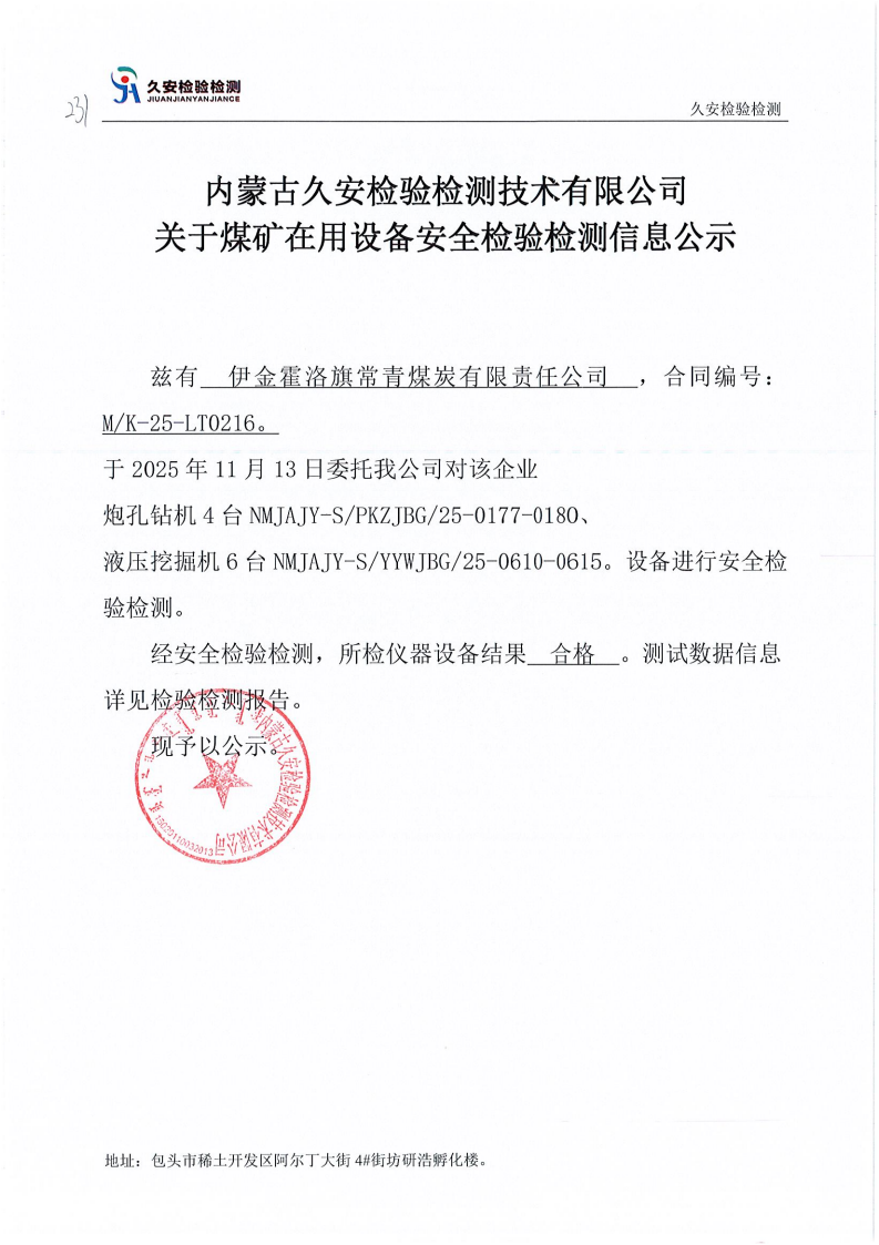 231.伊金霍洛旗常青煤炭有限责任公司煤矿在用设备安全检验检测信息公示