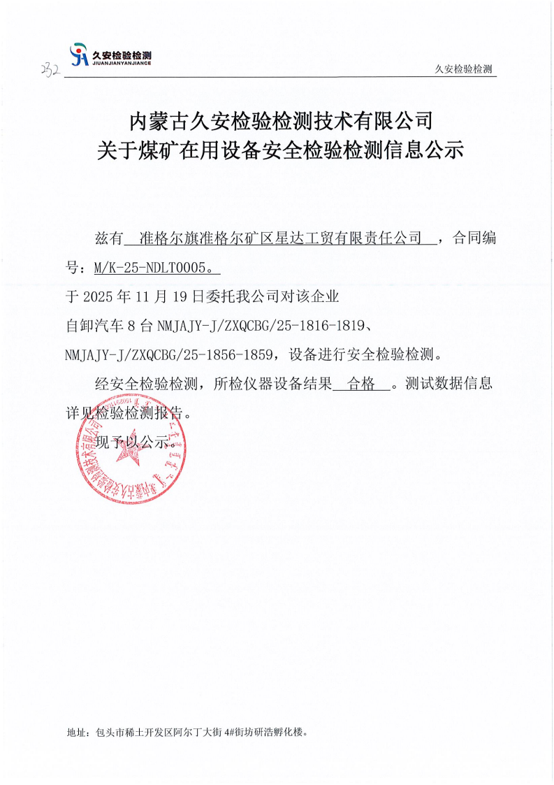 232.准格尔旗准格尔矿区星达工贸有限责任公司煤矿在用设备安全检验检测信息公示