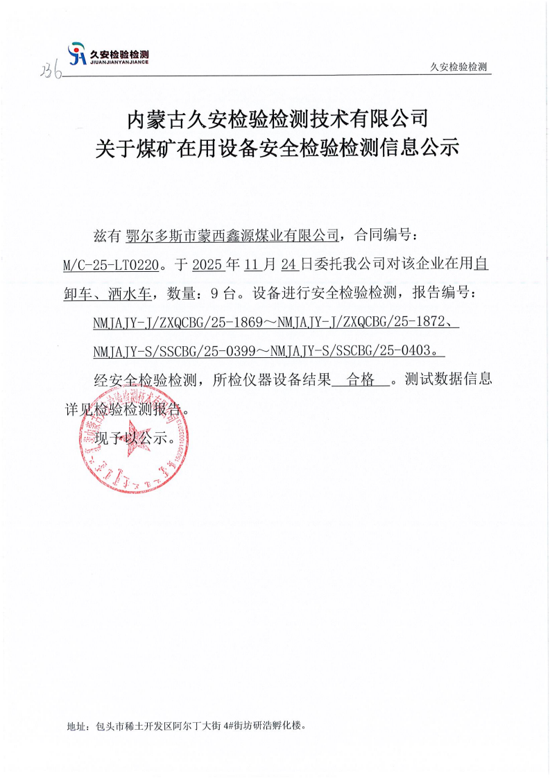 236.鄂尔多斯市蒙西鑫源煤业有限公司煤矿在用设备安全检验检测信息公示