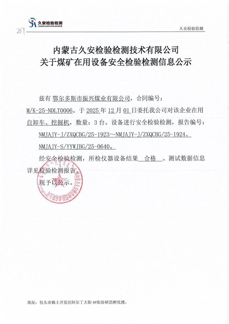 237.鄂尔多斯市振兴煤业有限公司煤矿在用设备安全检验检测信息公示
