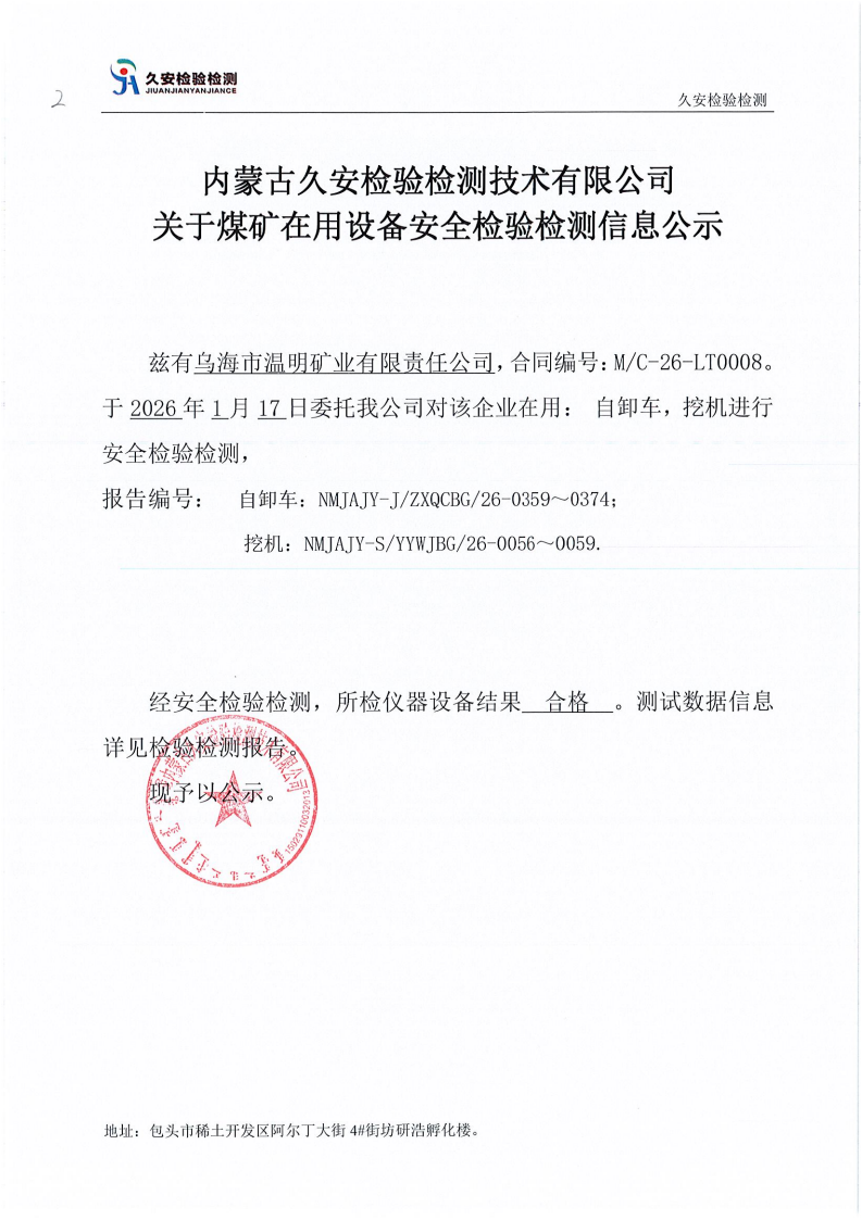 2.乌海市温明矿业有限责任公司煤矿在用设备安全检验检测信息公示
