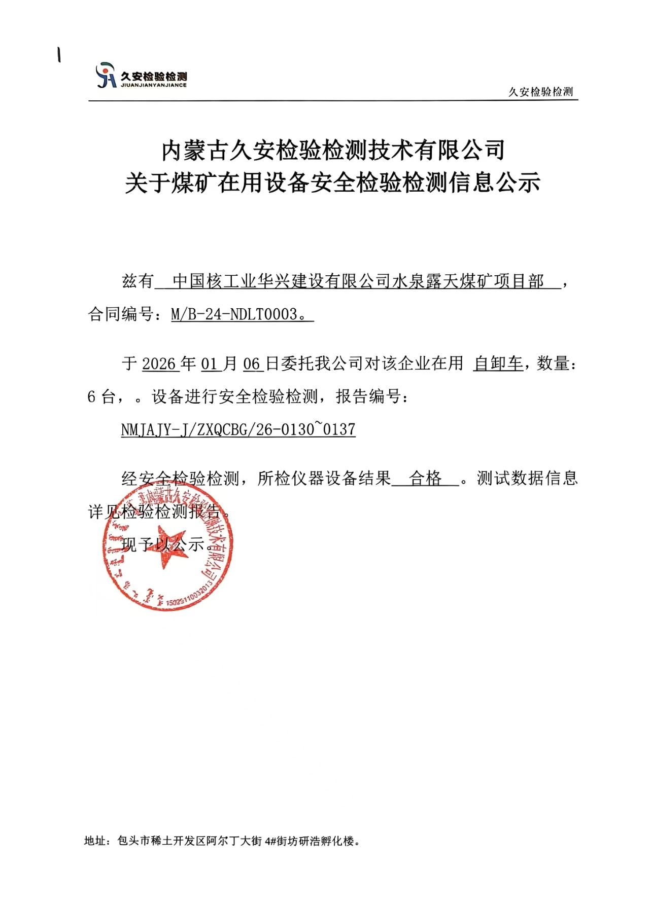 1.中国核工业华兴建设有限公司水泉露天煤矿项目部煤矿在用设备安全检验检测信息公示