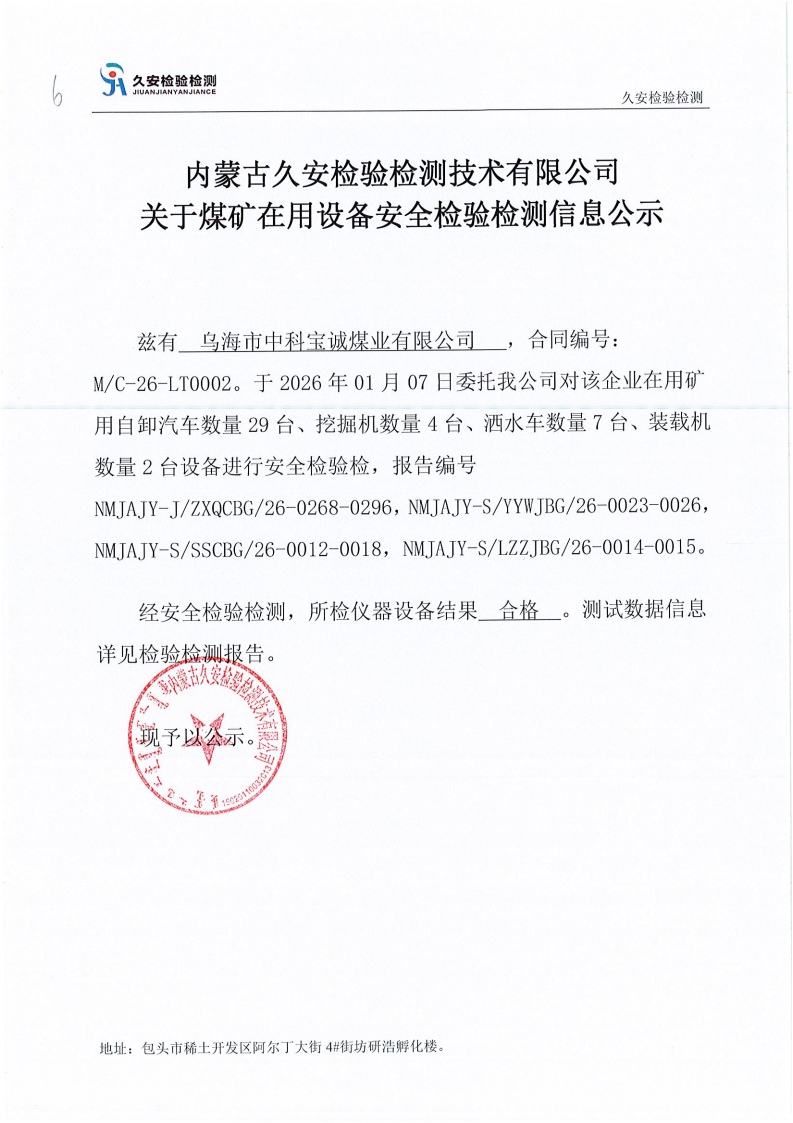 6.乌海市中科宝诚煤业有限公司煤矿在用设备安全检验检测信息公示