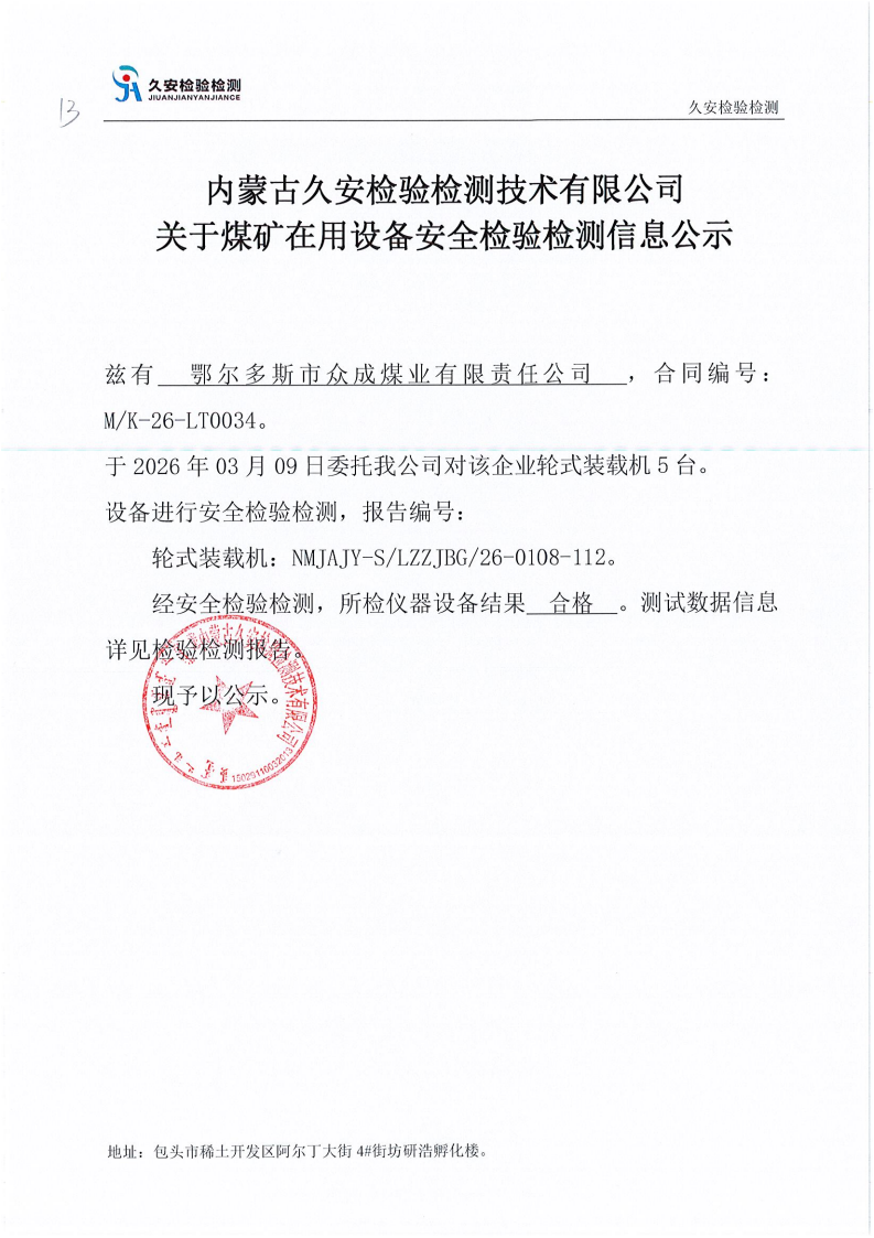 13.鄂尔多斯市众成煤业有限责任公司煤矿在用设备安全检验检测信息公示