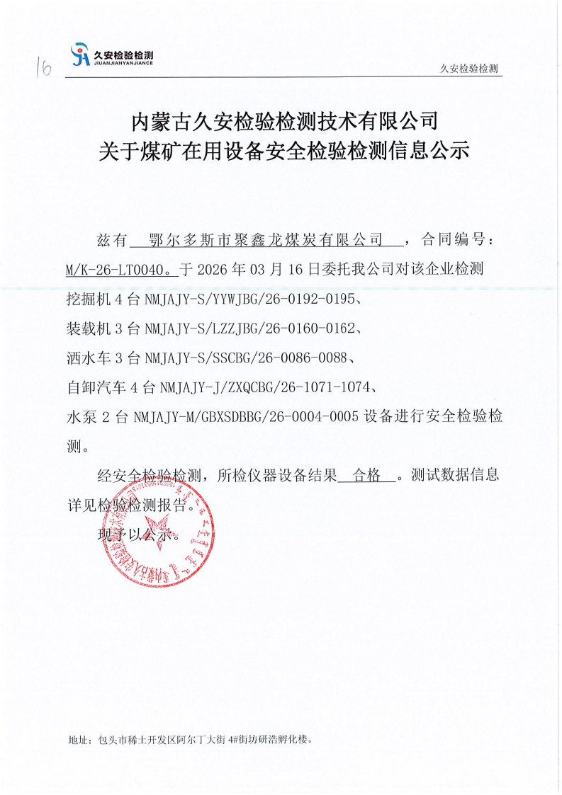 16.鄂尔多斯市聚鑫龙煤炭有限公司煤矿在用设备安全检验检测信息公示