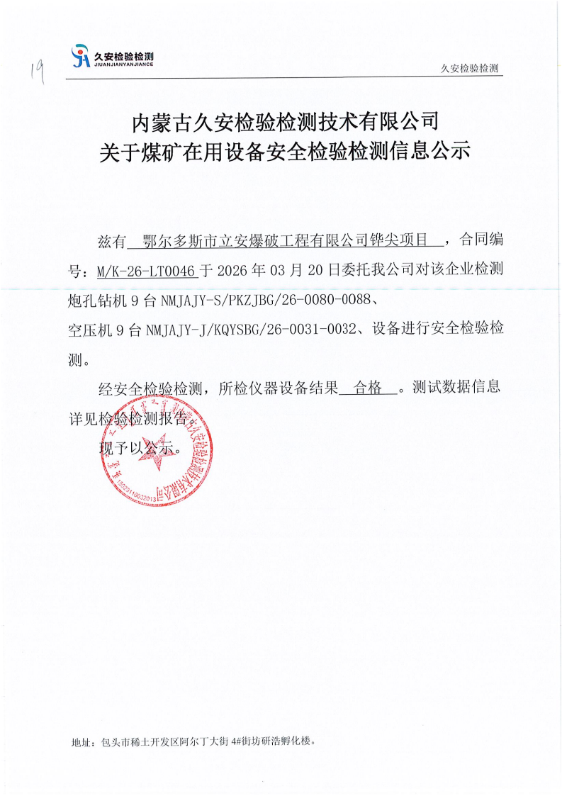 19.鄂尔多斯市立安爆破工程有限公司铧尖项目煤矿在用设备安全检验检测信息公示