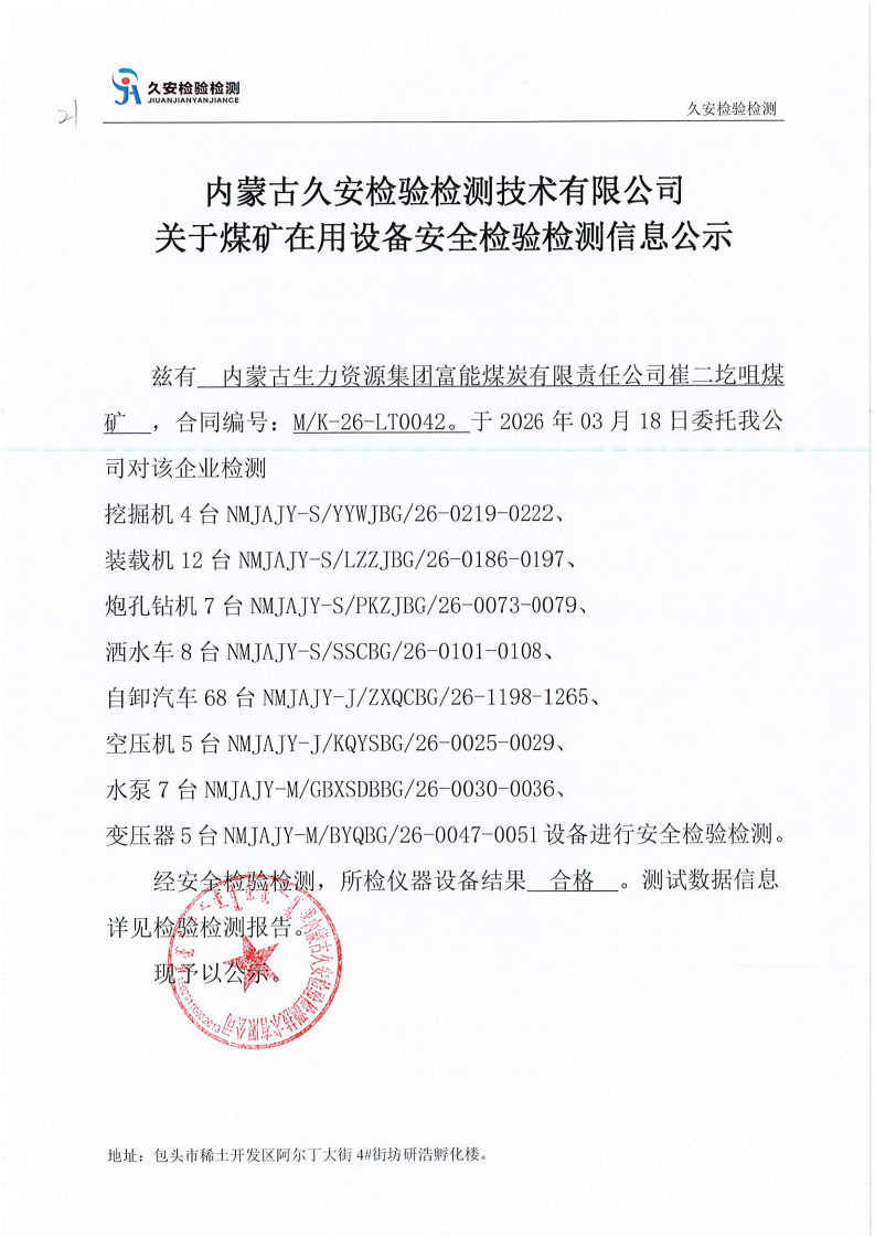 21.内蒙古生力资源集团富能煤炭有限责任公司崔二圪咀煤矿在用设备安全检验检测信息公示