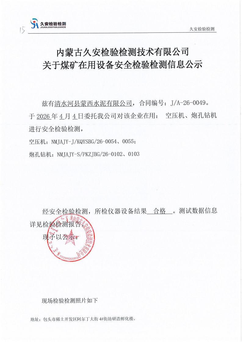 15.清水河县蒙西水泥有限公司金属非金属矿山在用设备安全检验检测信息公示