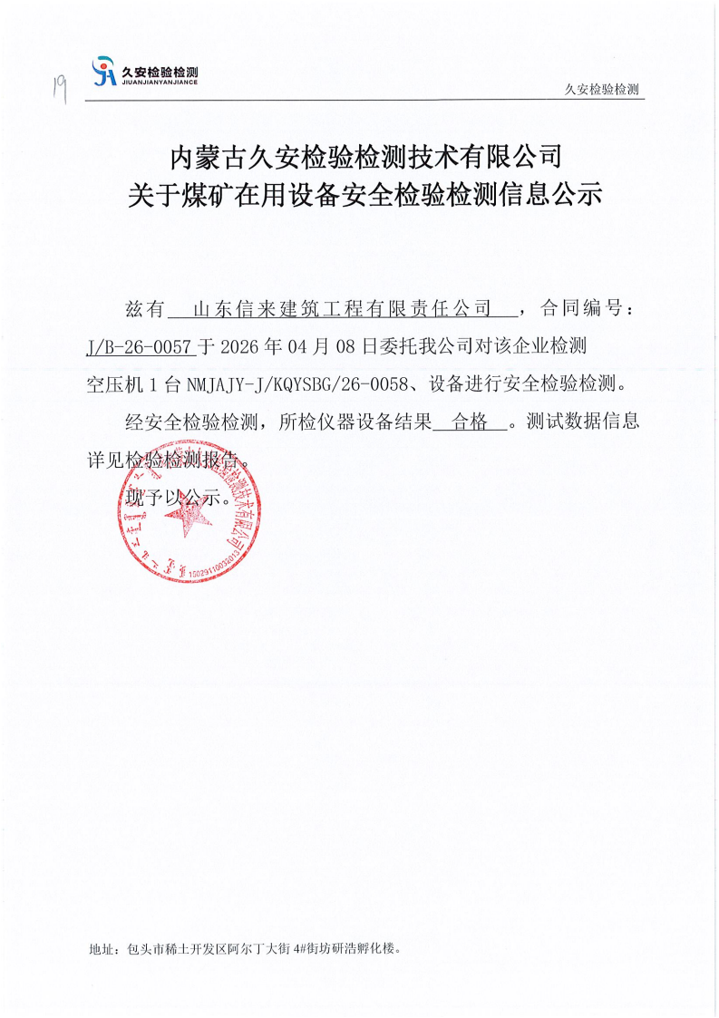 19.山东信来建筑工程有限责任公司金属非金属矿山在用设备安全检验检测信息公示