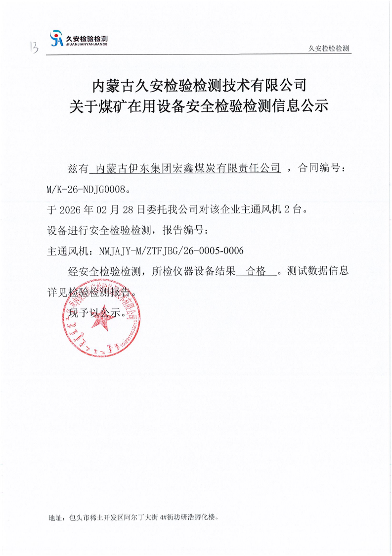 13.内蒙古伊东集团宏鑫煤炭有限责任公司煤矿在用设备安全检验检测信息公示