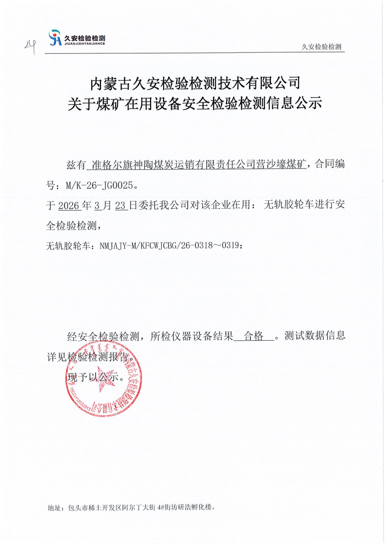 24.准格尔旗神陶煤炭运销有限责任公司营沙壕煤矿在用设备安全检验检测信息公示