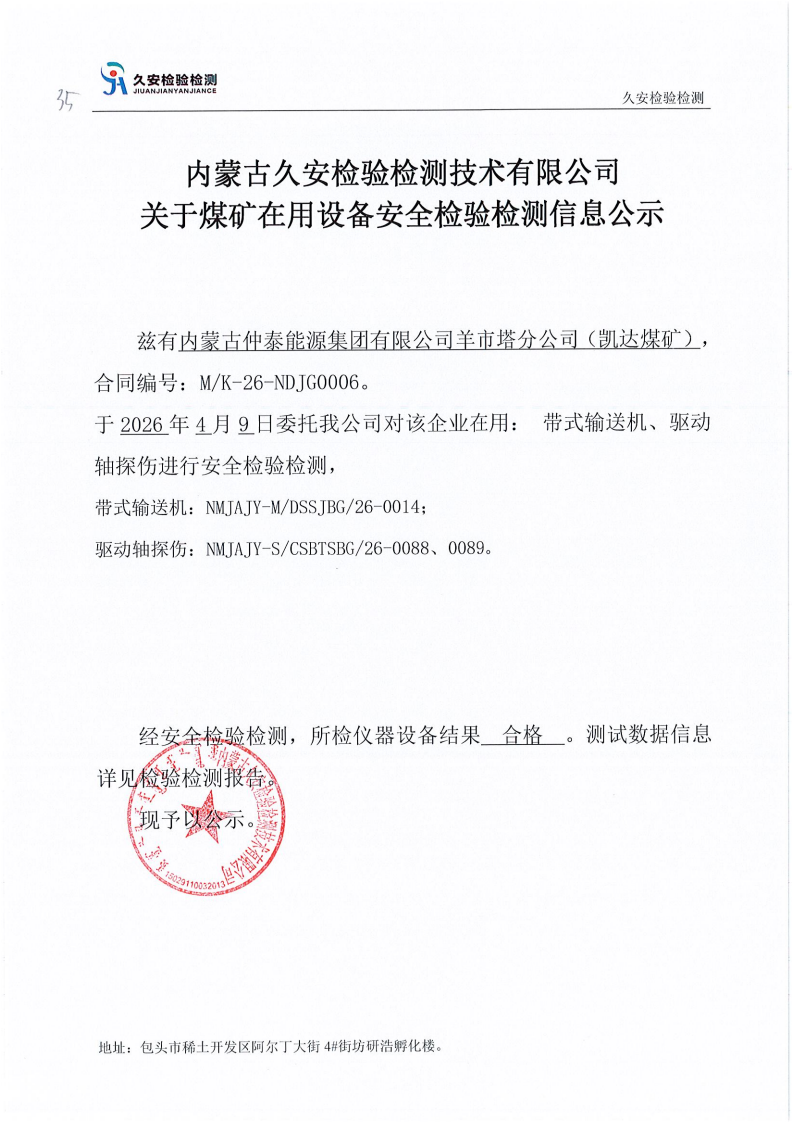 35.内蒙古仲泰能源集团有限公司羊市塔分公司(凯达煤矿)煤矿在用设备安全检验检测信息公示