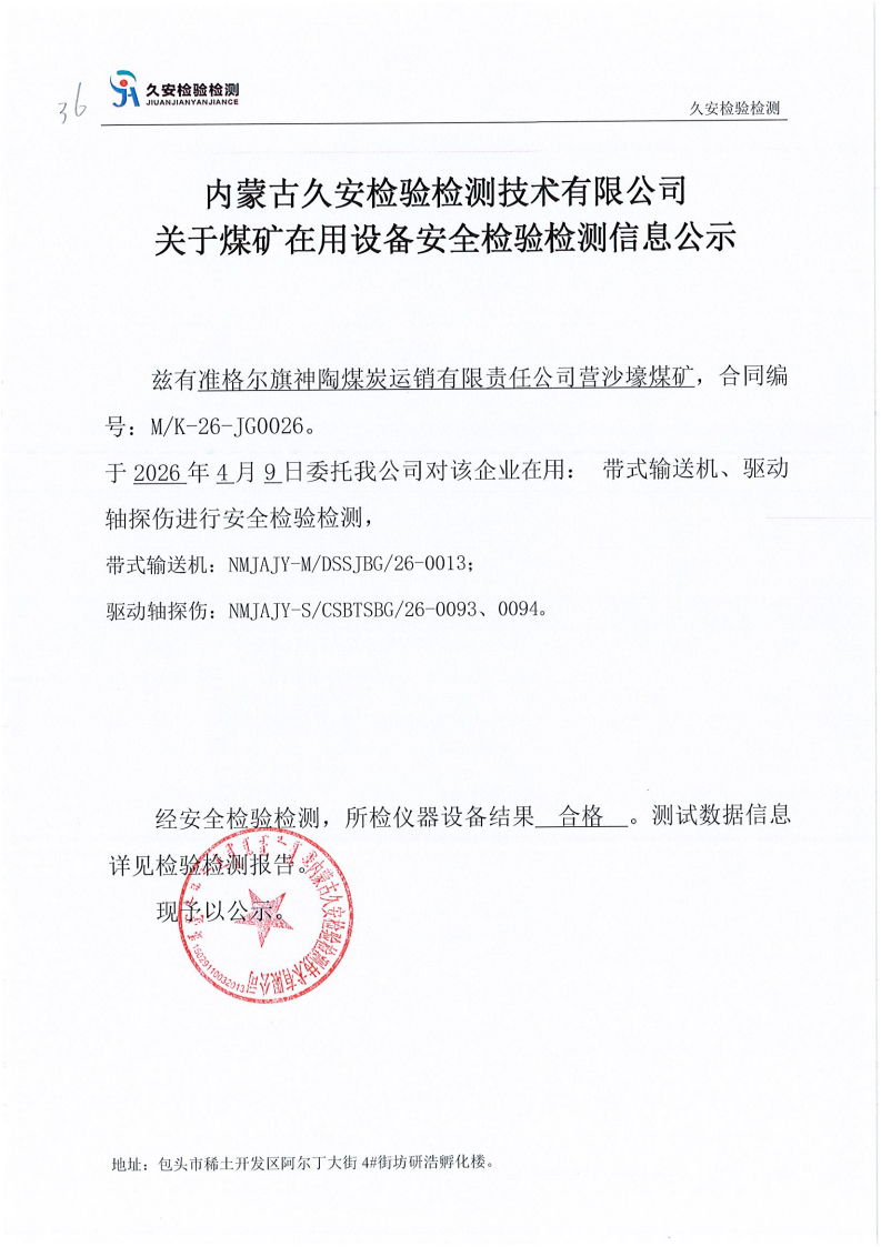 36.准格尔旗神陶煤炭运销有限责任公司营沙壕煤矿在用设备安全检验检测信息公示