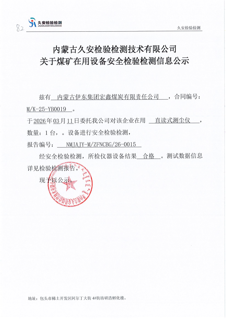 82.内蒙古伊东集团宏鑫煤炭有限责任公司煤矿在用设备安全检验检测信息公示