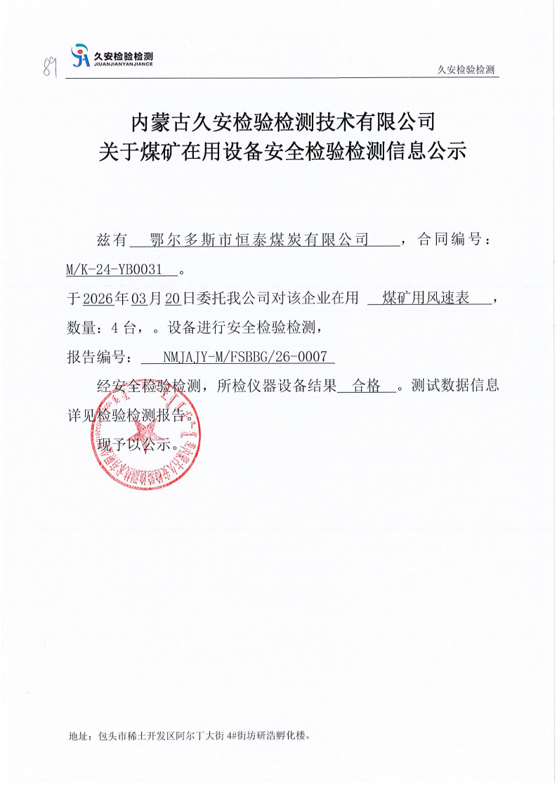 89.鄂尔多斯市恒泰煤炭有限公司煤矿在用设备安全检验检测信息公示