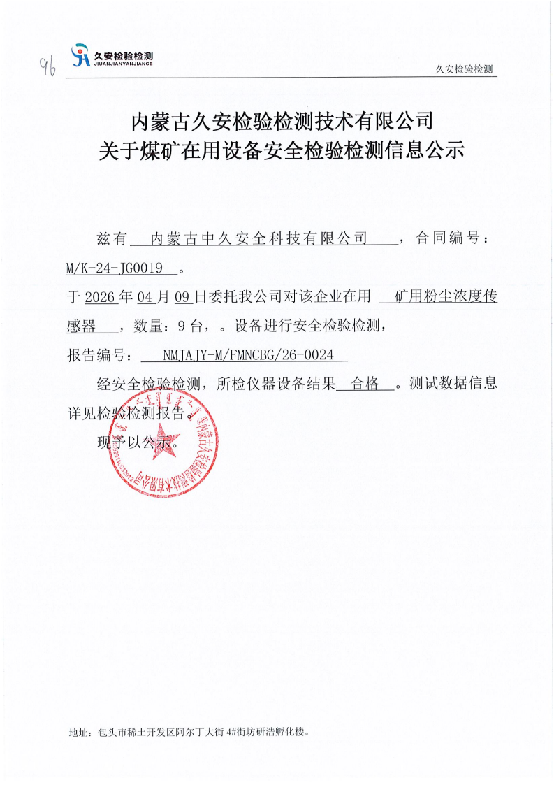 96.内蒙古中久安全科技有限公司煤矿在用设备安全检验检测信息公示